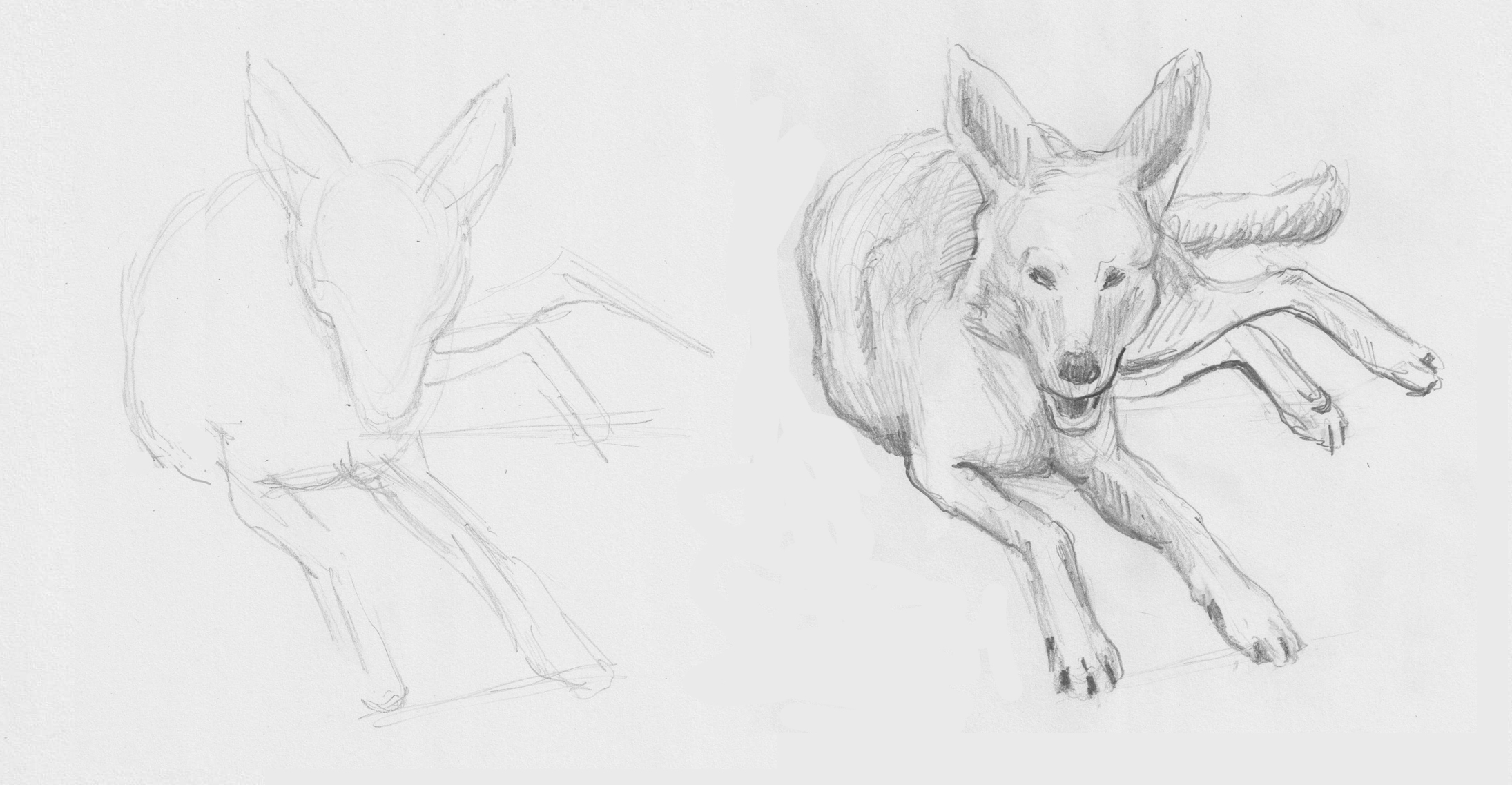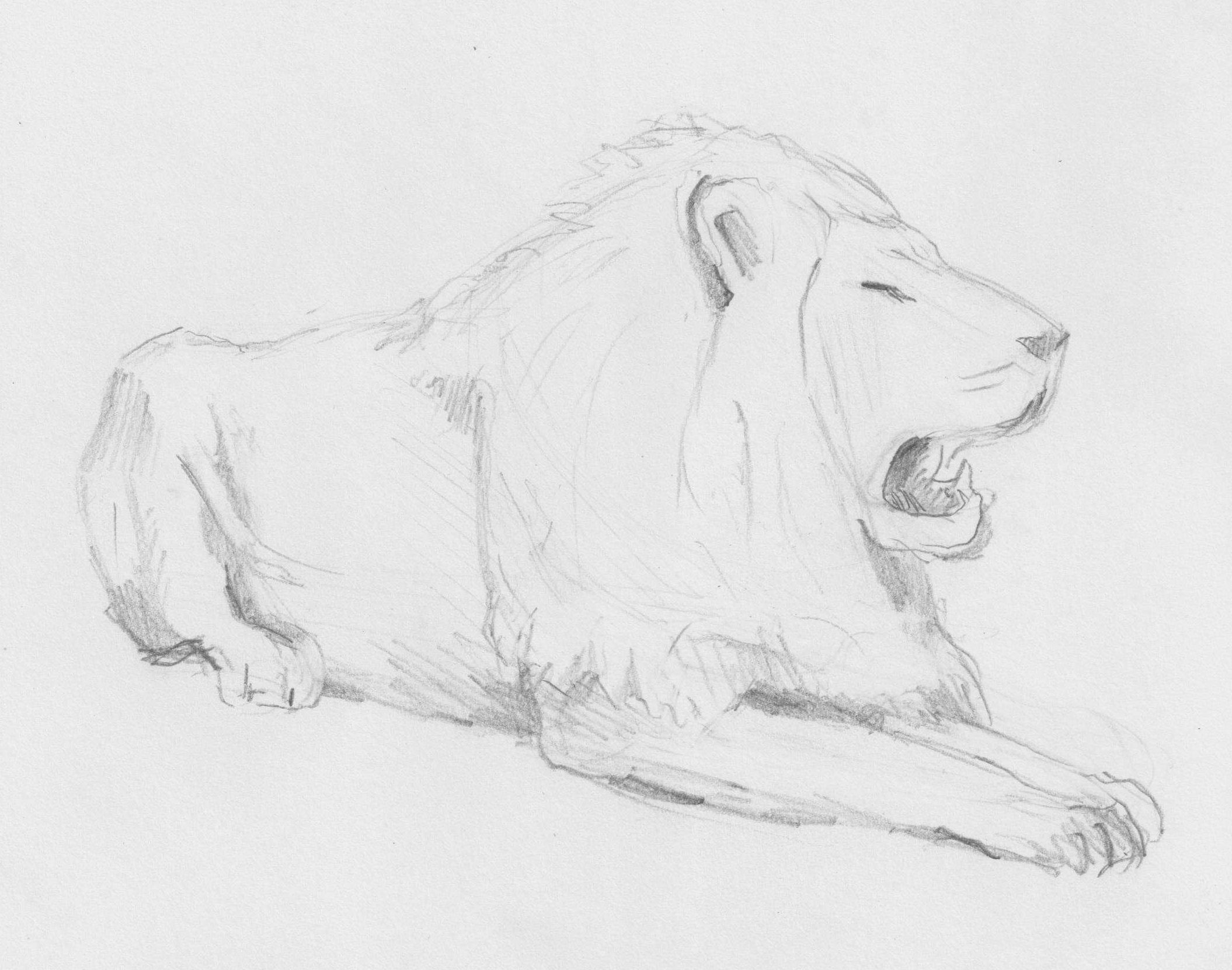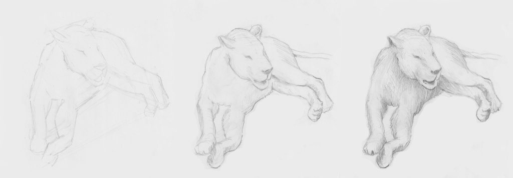 Bij het natekenen van dieren van een kleurenfoto in het volle licht moet je vaak zelf schaduwen toevoegen om de het lijf plastischer te maken. Voor de complexe houding van de leeuwin ben ik links begonnen in de gebroken tekenstijl met ook een paar hulplijnen.