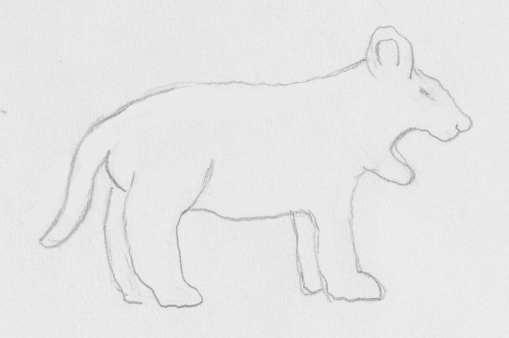 De huid van geschubde dieren zoals reptielen heeft de meest wonderlijke geribbelde structuren. Het is (in ieder geval voor mij) onmogelijk om precies na te tekenen maar je kan wel de suggestie van schubben geven. Ik laat je zien hoe ik dat heb geprobeerd met een hagedis. Ik ben begonnen met de vorm van het dier, met gebruik van hulplijnen voor de richtingen en verhoudingen.