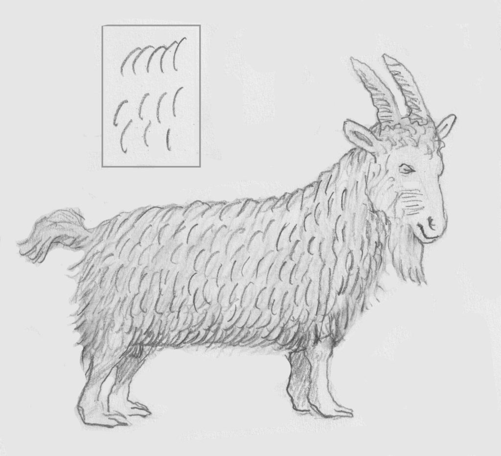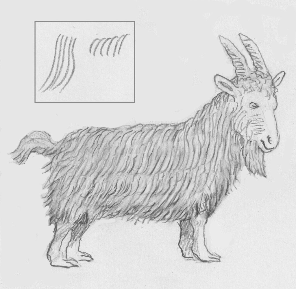 Je kunt een dier ook helemaal bedekken met een dikke vacht. Als voorbeeldje heb ik deze geit gekozen. Linksboven staat in een kadertje met welke lijntjes het is gedaan. Het is verder een kwestie van uitproberen met afwisselend licht en donker, niet te strak, niet overal precies hetzelfde.
