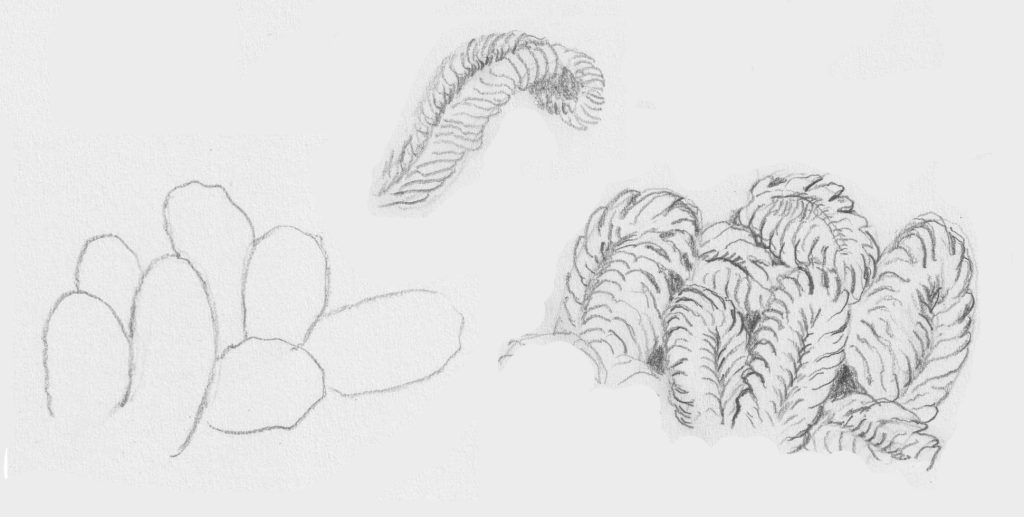 Daarna heb ik de tekening wat verder uitgewerkt met schubben, stekels en lijnen die de ronding van het lijf aangeven. De schubben heb ik zowel in de omtrek van de kop als daarbinnen getekend maar niet eens heel precies. Met licht en donker worden de vormen mooi rond.