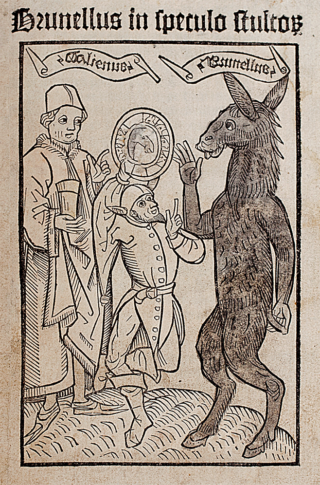 De fabel: Een betweterige ezel vraagt de dokter om een langere staart. De dokter links zegt dat hij daar niks aan kan doen is maar de ezel denkt dat hij het beter weet. Omdat hij blijft zeuren geeft de dokter hem dan maar een nepvoorschrift (dat natuurlijk nooit gaat helpen). In het midden houdt een nar met ezelsoren een spiegel voor zodat de ezel misschien zijn eigen domheid ziet. Ook de dokter wijst de ezel op de spiegel. Helaas denkt de ezel het nog steeds beter te weten. Betweters hebben nu eenmaal weinig zelfreflectie en zeker geen zelfspot. Houtsnede uit De Dwazenspiegel, 1490, Kunstenaar onbekend.