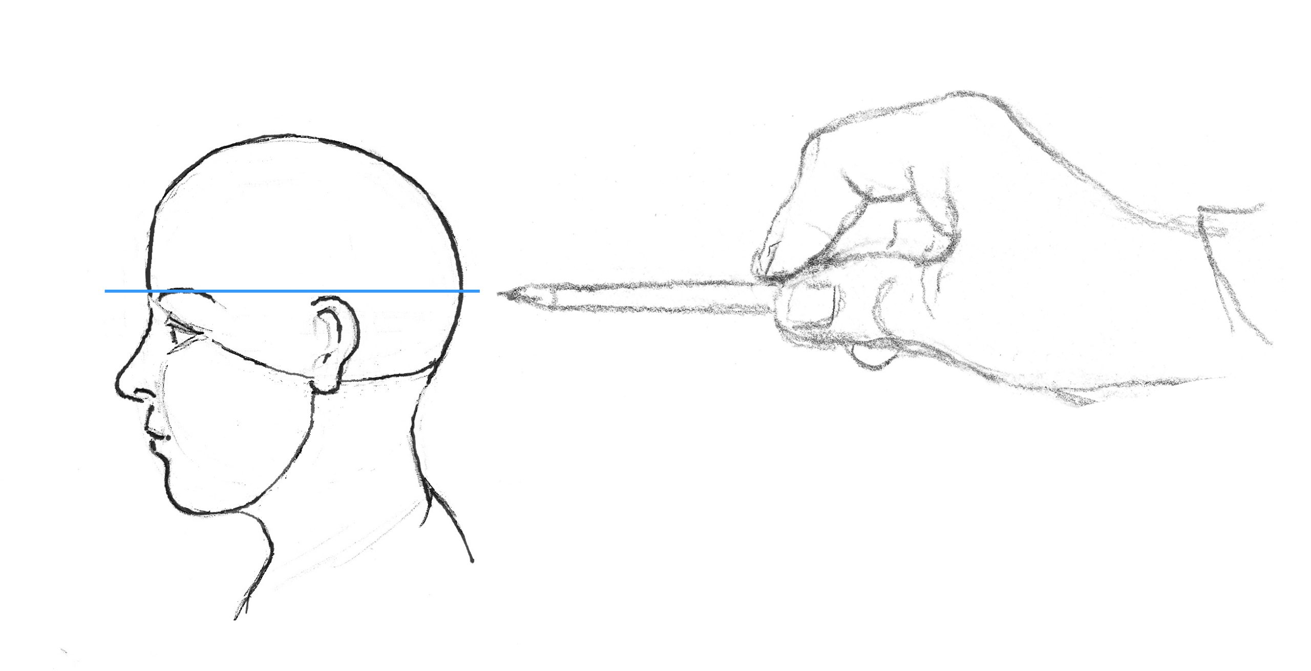Oefening 2: Zo kun je ook de positie van lichaamsdelen of andere objecten ten opzichte van elkaar inschatten. Je hoeft hulplijnen niet eens altijd te tekenen, als je ze in gedachten maar ziet. Probeer het uit met onderwerpen in je omgeving.