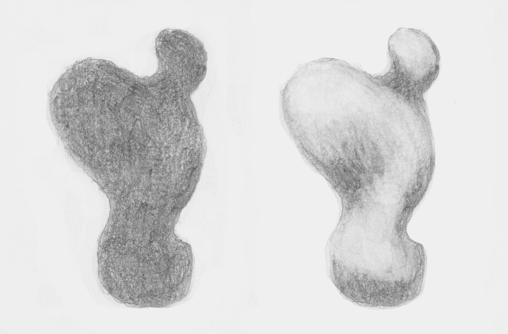 Oefening 6: Stel je voor dat de volgende getekende vormen witte abstracte beeldhouwwerken zijn. Teken er een paar zo licht mogelijk na en modelleer ze met wel of niet gearceerde schaduw. Kies voor elke vorm de lichtrichting die jou het mooist lijkt. Voeg toe wat je wilt.