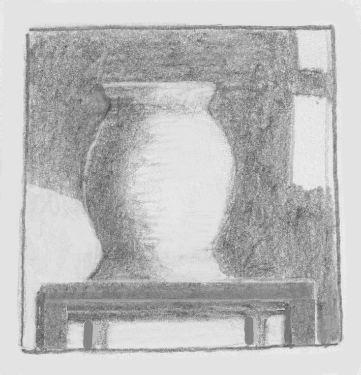 Zo’n streeploze manier van schaduw tekenen is bijvoorbeeld gebruikt in het cirkelvormige portretje en de vaas op tafel.