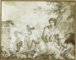 Once upon a time there was a young Greek man who went on a long and dangerous journey. The day before he left his girlfriend Dibutade saw the shadow shape of his head on a wall . She thought: “If only I could only keep seeing his profile while he is away!”. She picked up something sharp or a piece of chalk or maybe lipstick and drew the outline of the shadow on the wall while her dog watched. According to mythology this was the first portrait in art history. Many paintings were later made about this story.