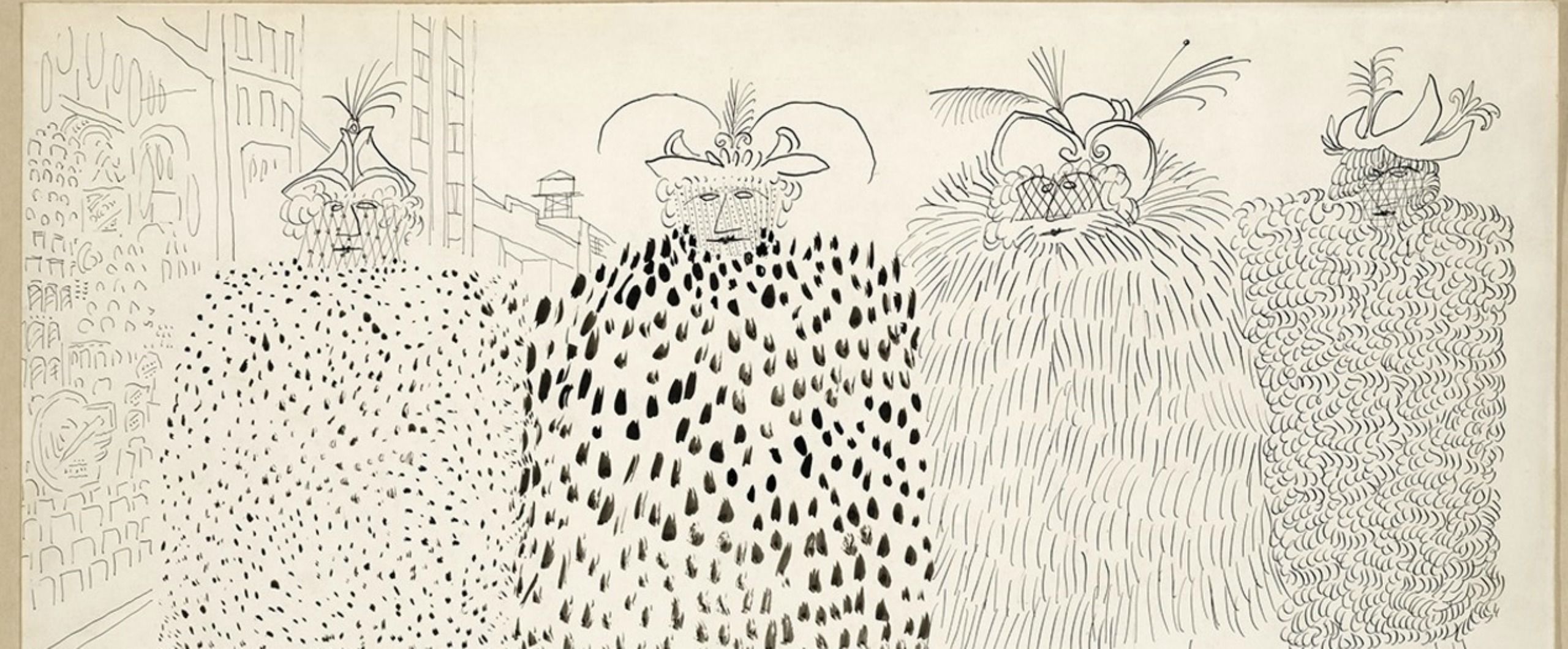 Exercise 1: Romanian-American illustrator Saul Steinberg used surface structures in a humorous way. Four dressed-up women wear enormously voluminous coats, each with a different surface structure. Draw two friends next to each other, both wearing such a huge voluminous coat.