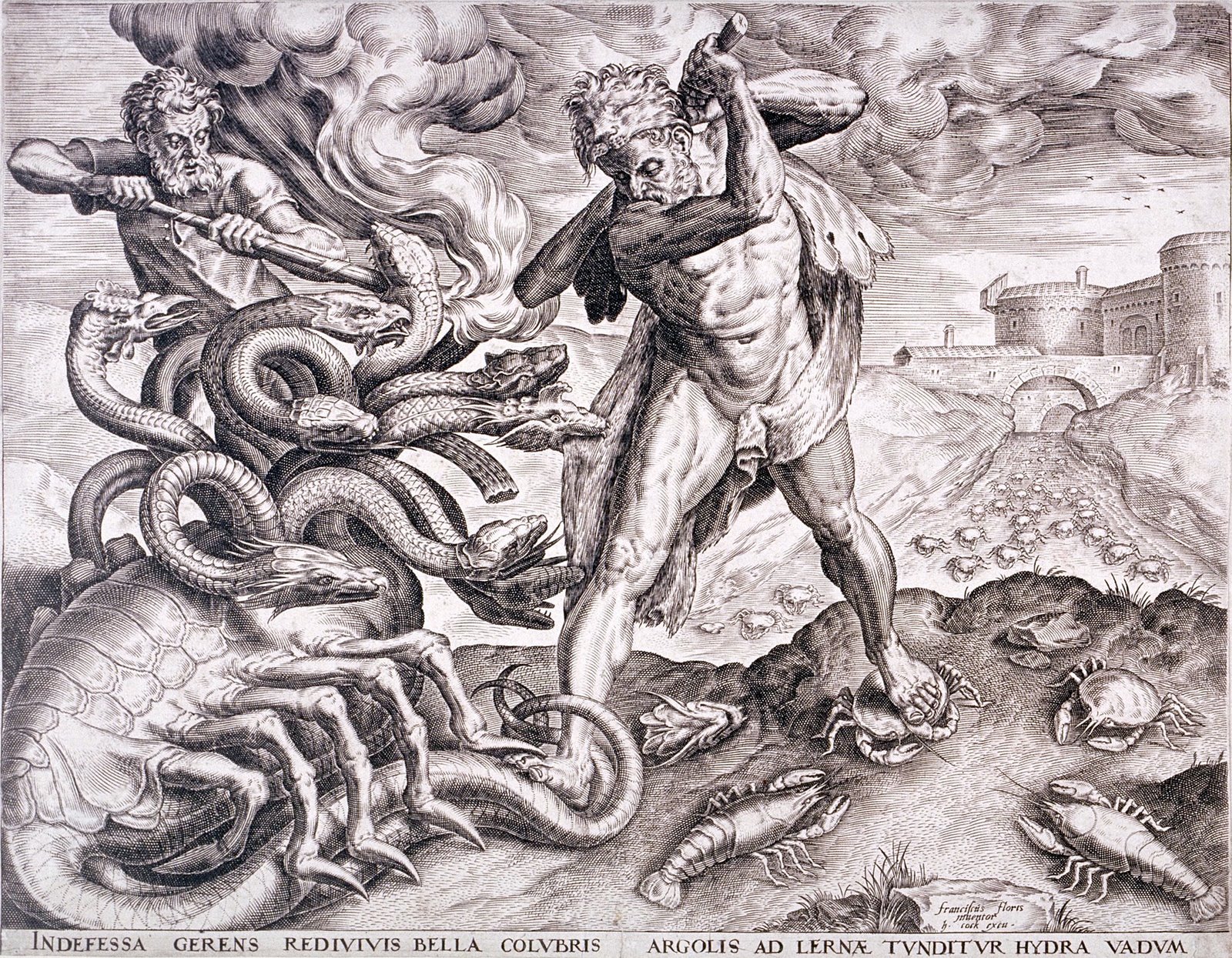 Mythology also features powerful figures, such as the demigod Heracles (or Hercules) from Greek mythology and Samson from the Bible. A spectacular engraving depicts Hercules battling the Lernaean Hydra, a multi-headed monster. The way the entire scene is conjured up in nuances of light and dark with delicate hatching is incredibly virtuosic.
