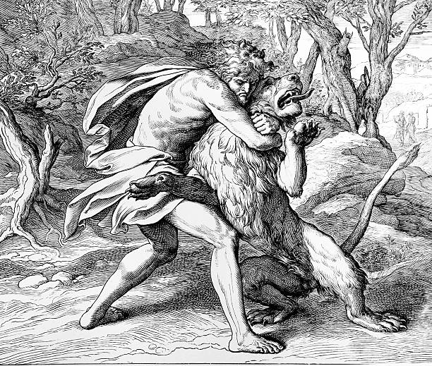 In an engraving of the biblical figure Samson about to slay a lion, the entire scene is conjured onto paper with fine hatching.