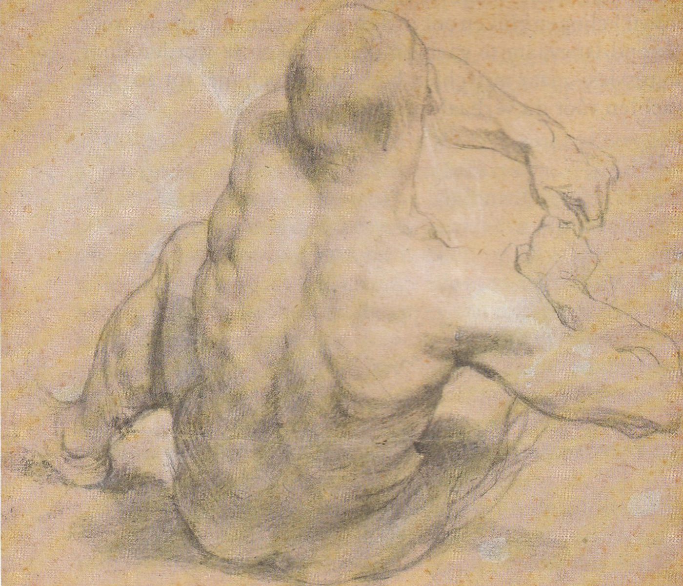 The Boymans van Beuningen Museum in Rotterdam owns a drawing by Anthony van Dyck depicting a seated nude man, seen from behind and above, apparently engaged in something requiring some effort. The chalk drawing, highlighted in white, is a study for a painting in St. Martin’s Church in Zaventem. It is a study of a lavender-colored nude model.